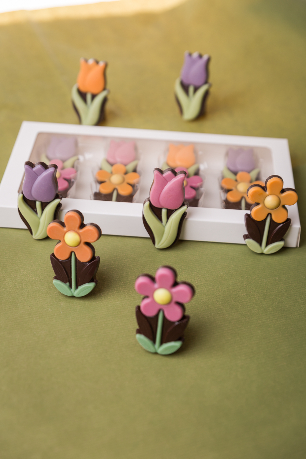 Sada polochých figurek ve tvaru tulipánů a sedmikrásek v krásné jarní krabičce s okénkem. Věnuj tyto květinové čokoládky jako dárek k MDŽ, ke Dni matek. 4 roztomilé tulipánky a 4 nádheré sedmikrásky budou krásným dárkem pro ženu.