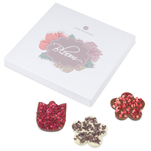 Čokoládový dárek pro ženu - ploché čokoládové figurky ve tvaru květin. Dokonalý dárek k MDŽ!