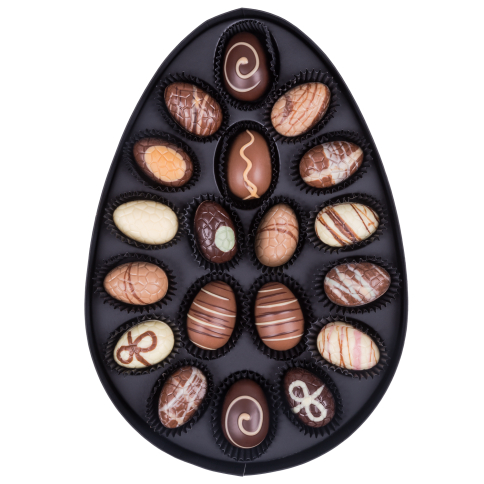 Součástí balení jsou čtyři ručně vyrobené pralinky vytvořené z nejkvalitnější belgické čokolády nejlepšími evropskými čokolatiéry. Každá z nich ukrývá sametovou náplň, která se rozplývá na jazyku a poskytuje nezapomenutelný chuťový zážitek. Velikonoční kraslice z bílé čokolády je zabalena v elegantní černé prémiové krabičce se zdobením a zásuvkou, díky čemuž je dárek připravený k okamžitému předání.