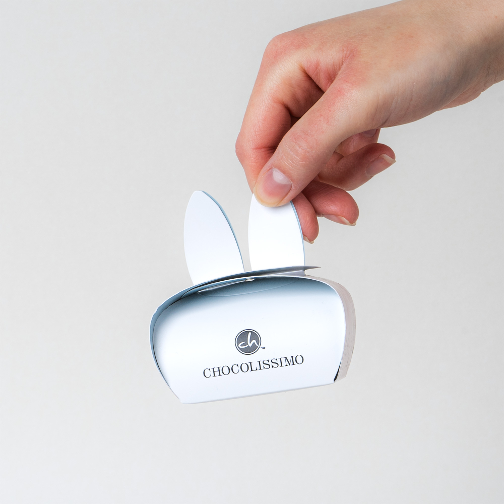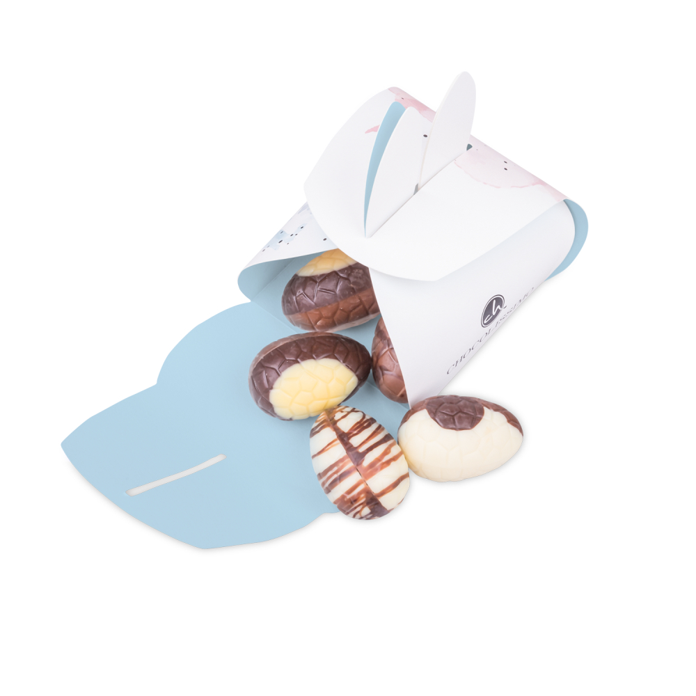 Roztomilá krabička s králičími uši skrývá 5 čokoládových mini vajíček. Úžasné velikonoční vajíčka s lahodnou náplní v této originální králičí krabičce rozzzáří tvář každého - dítěte i dospělého koledníka! Veselá krabička se sladkým obsahem je naše doporučení na sladký velikonoční dáreček.