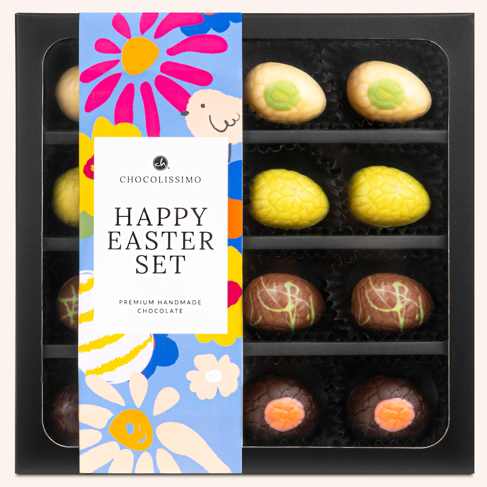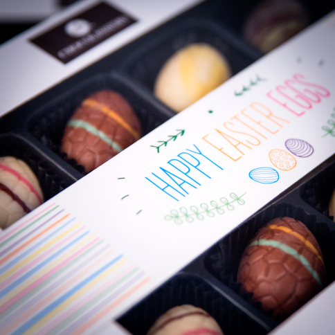 Do bílé krabičky s okénkem jsme umístili celý tucet vajec. Ale ne ledajakých vajec, jde totiž o ručně vyráběné čokoládové prlainky v podobě velikonočních kraslic. Čokoládové vajička se liší zdobením a náplní, ale spojuje je jedno - jsou dílém čokoládových mistrů střední Evropy. Letošní velikonoce budou rozhodně veselé a čokoládové o čem se přesvědčíte sami až tyto dokonalé čokoládové vajíčka ochutnáte.