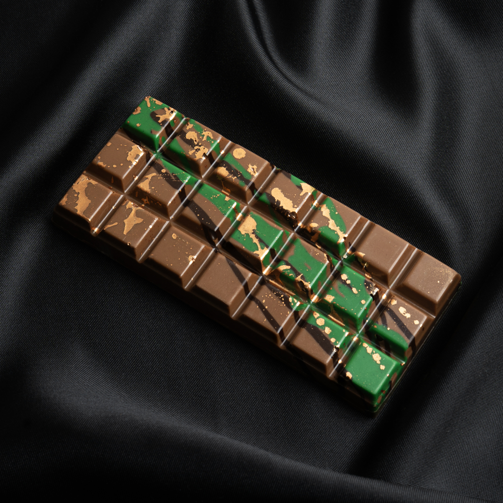 Složení: cukr, pistácie, kakaový tuk, plnotučné mléko v prášku, pšeničná mouka, voda, kakaová hmota, syrovátka v prášku, emulgátor: sójový lecitin; sezam, přírodní aroma: vanilka; sůl, barviva: E100, E133. Kakaová hmota v mléčné čokoládě minimum 33%. Může obsahovat vejce, arašídy.
